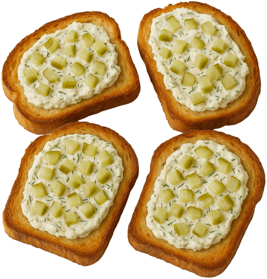 - Mientras se tuestan, mezcla el queso crema con los pepinillos picados, el eneldo y el ajo en polvo (si lo usas).